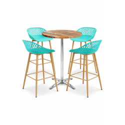 Designer bar stool, metal frame imitation of wood, seat and back in pastel green injected polypropylene. Available in other colors. We can offer similar chair and armchair