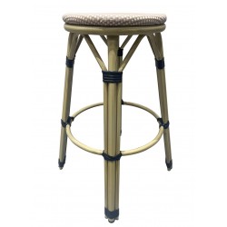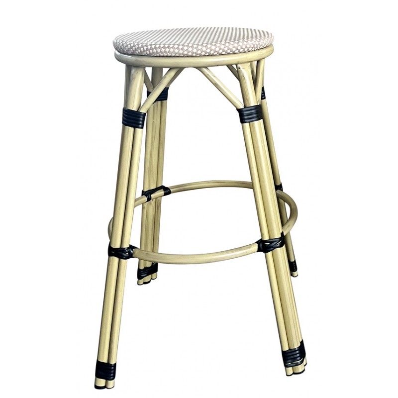 Designer barstool, aluminum, seat in beige and brown mesh. For outdoor and indoor use. Available in other colors. Armchair with same design.