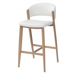 Designer barstool, metal frame with finishing in wood color epoxy, seat and back upholstered in white synthetic leather. We can offer similar chair