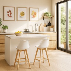 Designer bar stool, wood, white seat, white cushion. We can offer similar chairs and armchairs. Seat height 72 cms