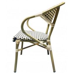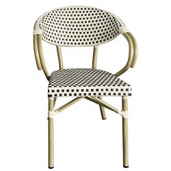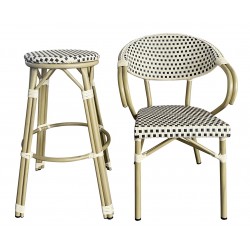 Designer armchair, aluminum, seat and back in beige and brown rattan. For outdoor and indoor use. Available in other colors. Barstool with same design.