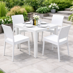 Stackable chair, rattan imitation, white polypropylene. For outdoor and indoor use. Available in other colors. We can offer similar tables