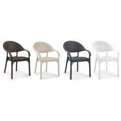 Stackable armchair, rattan imitation, chocolate brown polypropylene. For outdoor and indoor use. Available in other colors. We have tables in the same color.