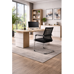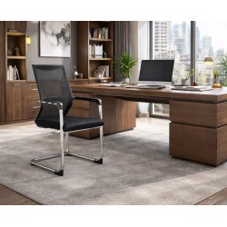 Fixed sled base office chair, design, chromed, upholstered in black mesh fabric.