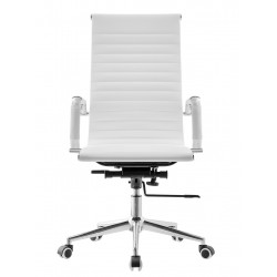 Executive office chair, high, gas, tilt deep swinging, upholstered in white synthetic leather. Available in other colors.