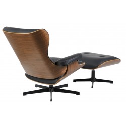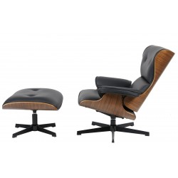 Lounge chair and ottoman, design, wood, upholstered in black synthetic leather. Available in other colors.