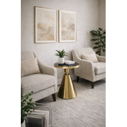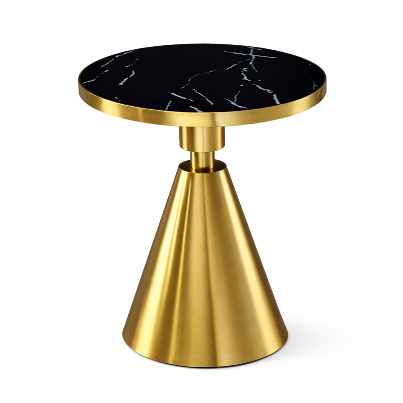 Mesa baja, diseño, armazón de acero inoxidable con acabado dorado, tapa de cerámica imitando a mármol negro, 50 cms de diámetro. Altura 56 cms. Otros colores disponibles