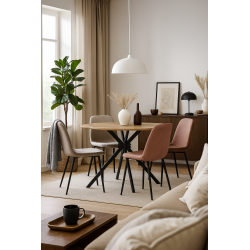 Mesa de diseño, armazón metálico con acabado negro, tapa de DM madera bilaminada