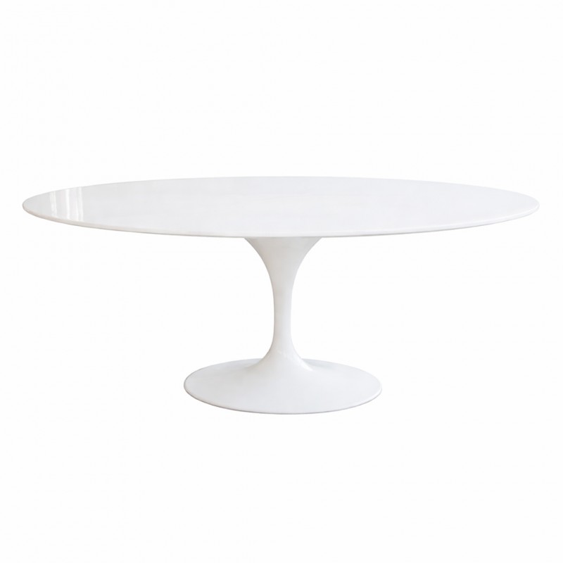 Mesa de diseño ovalada, base de fibra de vidrio, tapa lacada blanca de 180x108 cms. Sillas y sillones a juego