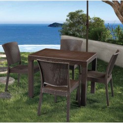 Mesa de diseño, imitación a rattán, polipropileno de color chocolate. Otros colores y medidas disponibles. Silla y sillón a juego