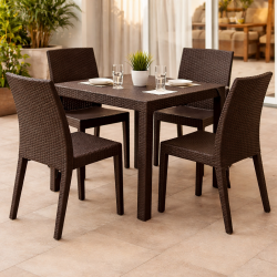 Mesa de diseño, imitación a rattán, polipropileno de color marrón chocolate, 80 x 80 cms. Otros colores y medidas disponibles. Silla y sillón a juego