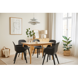 Mesa de diseño, armazón de madera de hevea con tapa chapada, acabado natural. Sillas y sillones a juego