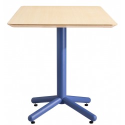 Mesa alta de diseño, multiusos, armazón central tubular con acabado azul, tapa cuadrada de contrachapado revestido con HPL con acabado natural. Taburete y mesas a juego.