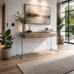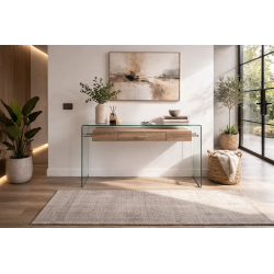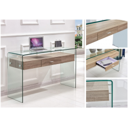 Consola de diseño, estante de MDF con cajón, cristal curvado, 12 mm. de espesor.