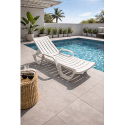 -Tumbona con reposabrazos, estructura de polipropileno de color blanco, muy resistente, 5 posiciones, apilable.