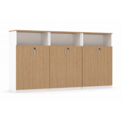 Armario medio con puertas, estantes, blanco y roble. Mesas a juego.