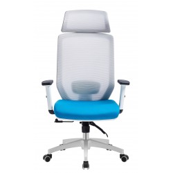 Sillón de oficina, blanco, regulación de altura, malla gris, tejido azul claro. Brazos regulables en altura. Otros colores disponibles