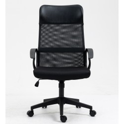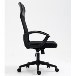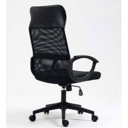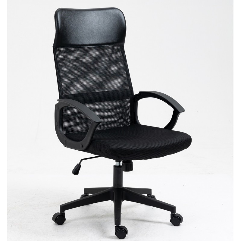 -Tapizado del respaldo en malla de color negro, cabezal en similpiel negra y asiento en tejido acrílico negro