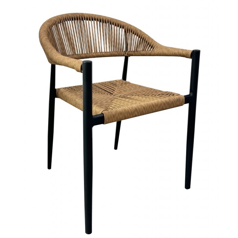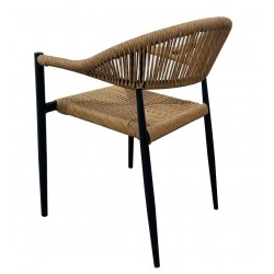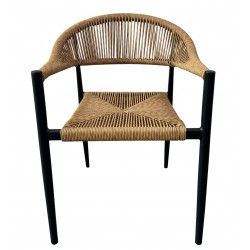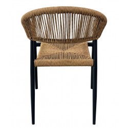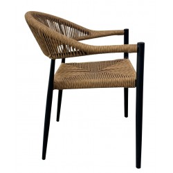 Sillón de diseño, aluminio, respaldo y asiento en ratán marrón. Uso en exterior e interior.