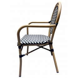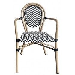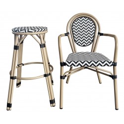 Sillón de diseño, aluminio, asiento y respaldo en mesh blanco y negro. Uso en exterior e interior. Otros colores disponibles. Taburete a juego