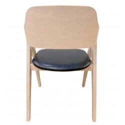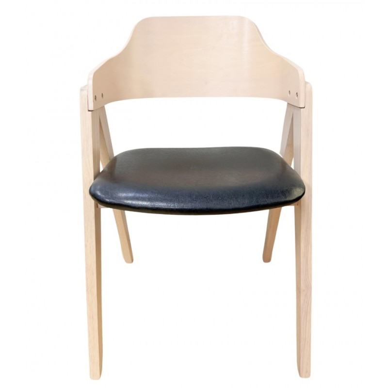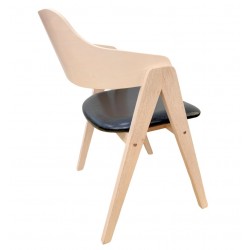 Sillón de diseño, multiusos, armazón de madera maciza de hevea, respaldo de contrachapado de madera de hevea, barnizado natural, asiento tapizado similpiel negra. Taburete a juego con el mismo tapizado y acabado