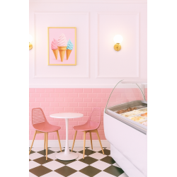 Silla de diseño, base de metal con acabado imitación madera, asiento y respaldo de polipropileno inyectado de color rosa oscuro. Otros colores disponibles. Taburete del mismo color