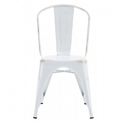 Silla de diseño, estructura de acero, pintada en blanco con acabado vintage. Uso en interiores o exteriores. Otros acabados y colores disponibles. Mesa, sillón y taburete a juego.