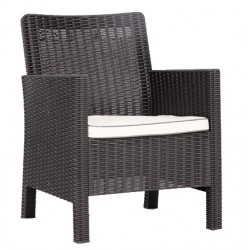 Sillón imitación a rattán, polipropileno marrón chocolate, cojin beige. Uso en exterior e interior. Mesas a juego.