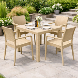 Sillón apilable, imitación a rattán, polipropileno capuccino. Uso en exterior e interior. Otros colores disponibles. Mesas a juego