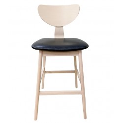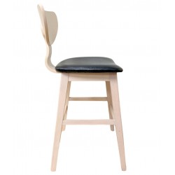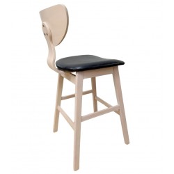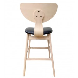 Taburete de diseño, multiusos, armazón de madera maciza de hevea, asiento y respaldo de contrachapado de madera de hevea, barnizado natural, tapizado similpiel negra. Silla a juego
