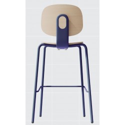 Taburete de diseño, multiusos, apilable, armazón tubular con acabado azul, asiento y respaldo de contrachapado revestido con HPL con acabado natural. Sillas y mesas a juego.