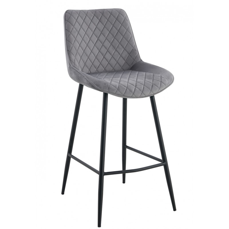 Taburete de diseño, armazón metálico con acabado epoxi negro, asiento y respaldo tapizados en terciopelo gris claro. Otros colores disponibles.