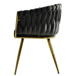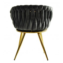Cadeirão moderno, veludo cinza escuro, base de metal com acabamento cromo dourado
